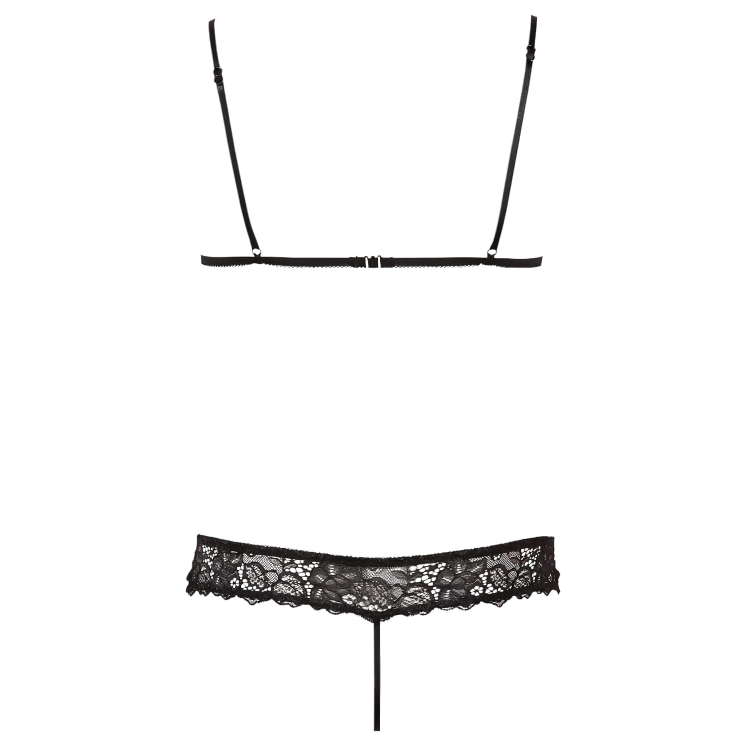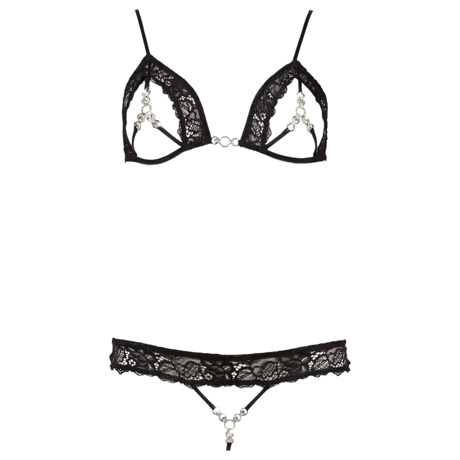 De kantenset versierd met strass-steentjes is een ware bijzonderheid die je vrouwelijkheid benadrukt en je zelfvertrouwen geeft. Het open onderstuk en het opvallende borstoppervlak zijn tegelijkertijd gewaagd en provocatief, terwijl het zachte, flexibele materiaal zorgt voor draagcomfort. Het fijne kanten patroon versterkt de luxe uitstraling van de set met zijn elegante detaillering.