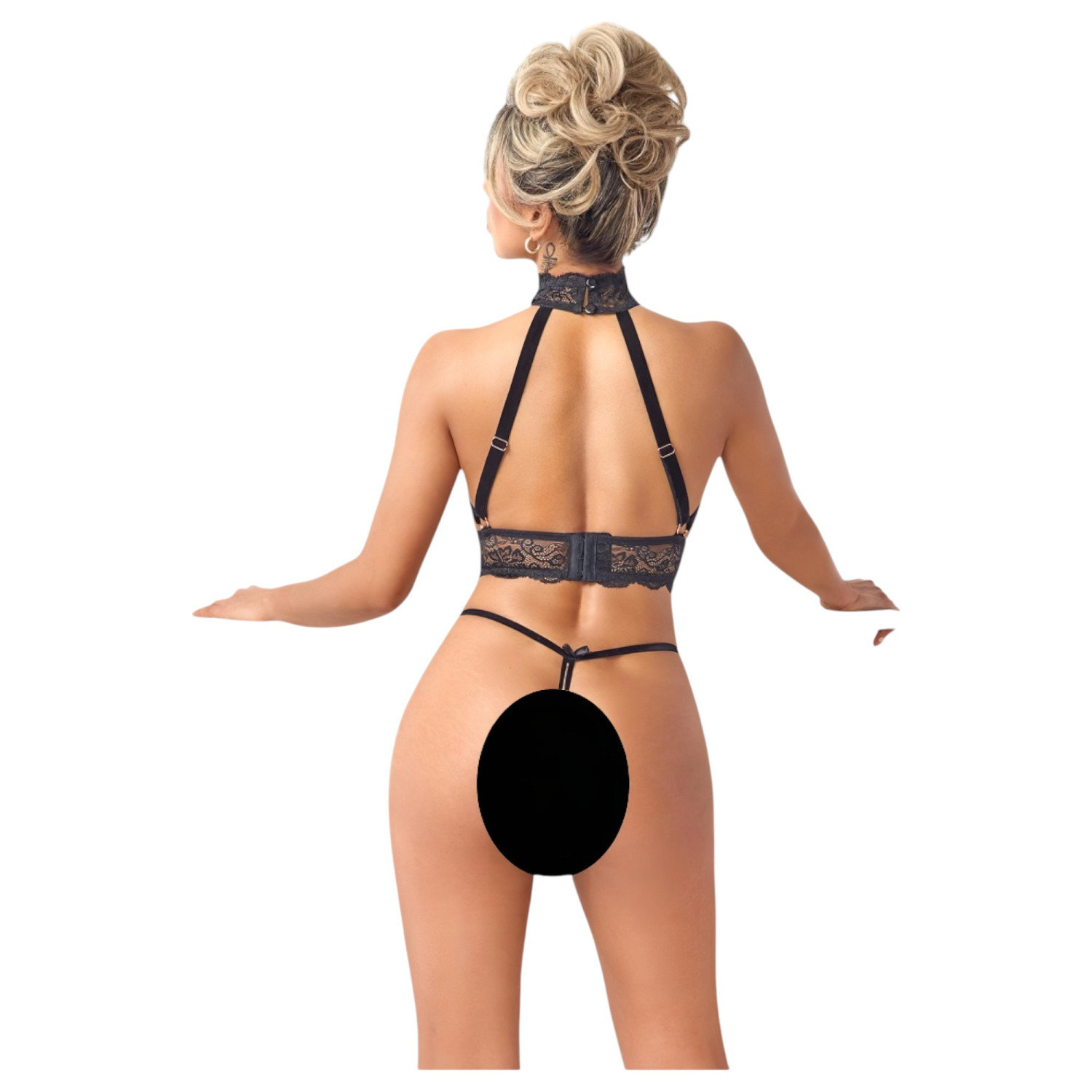 Deze sexy set biedt een gedurfde en verfijnde uitstraling door de combinatie van zacht kant, fluwelen bandjes en roségouden kettingen. Perfecte keuze om de nacht op te zwepen en je partner op een sensuele manier te verleiden.