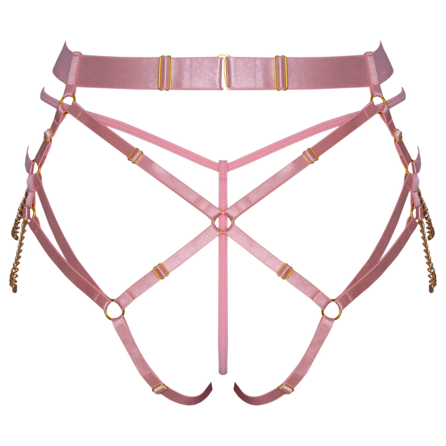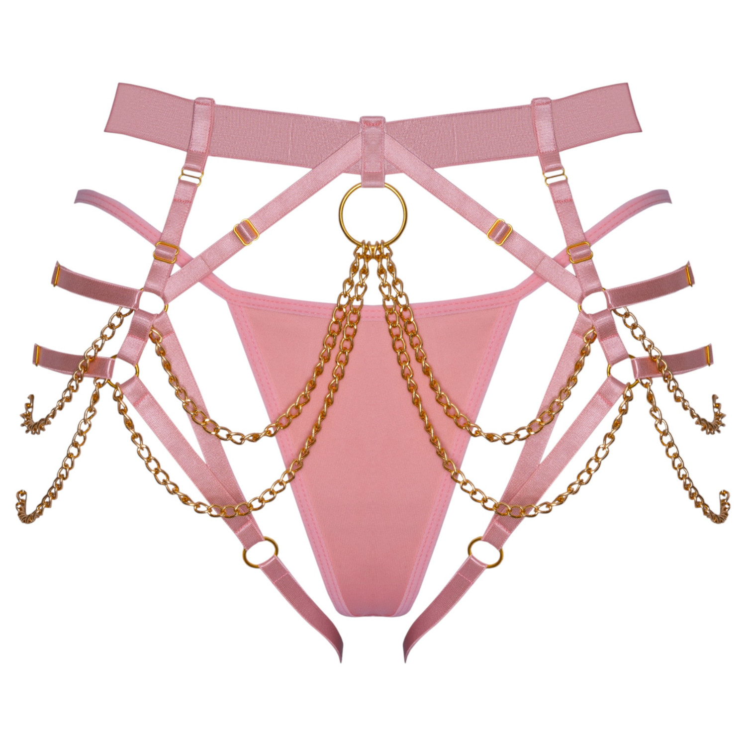 De Bad Kitty kettingharnas met string is de perfecte keuze als je een gedurfde, maar toch elegante look wilt. De roze, licht glanzende banden en de goudkleurige metalen accessoires geven een glamoureuze uitstraling. De vooraan en zijdelings geplaatste in het oog springende kettingen versterken het erotische effect, terwijl de verstelbare, flexibele banden zorgen voor comfortabel dragen. Het setje bevat ook een aparte mini-string, die een discretere, maar toch sexy optie biedt.