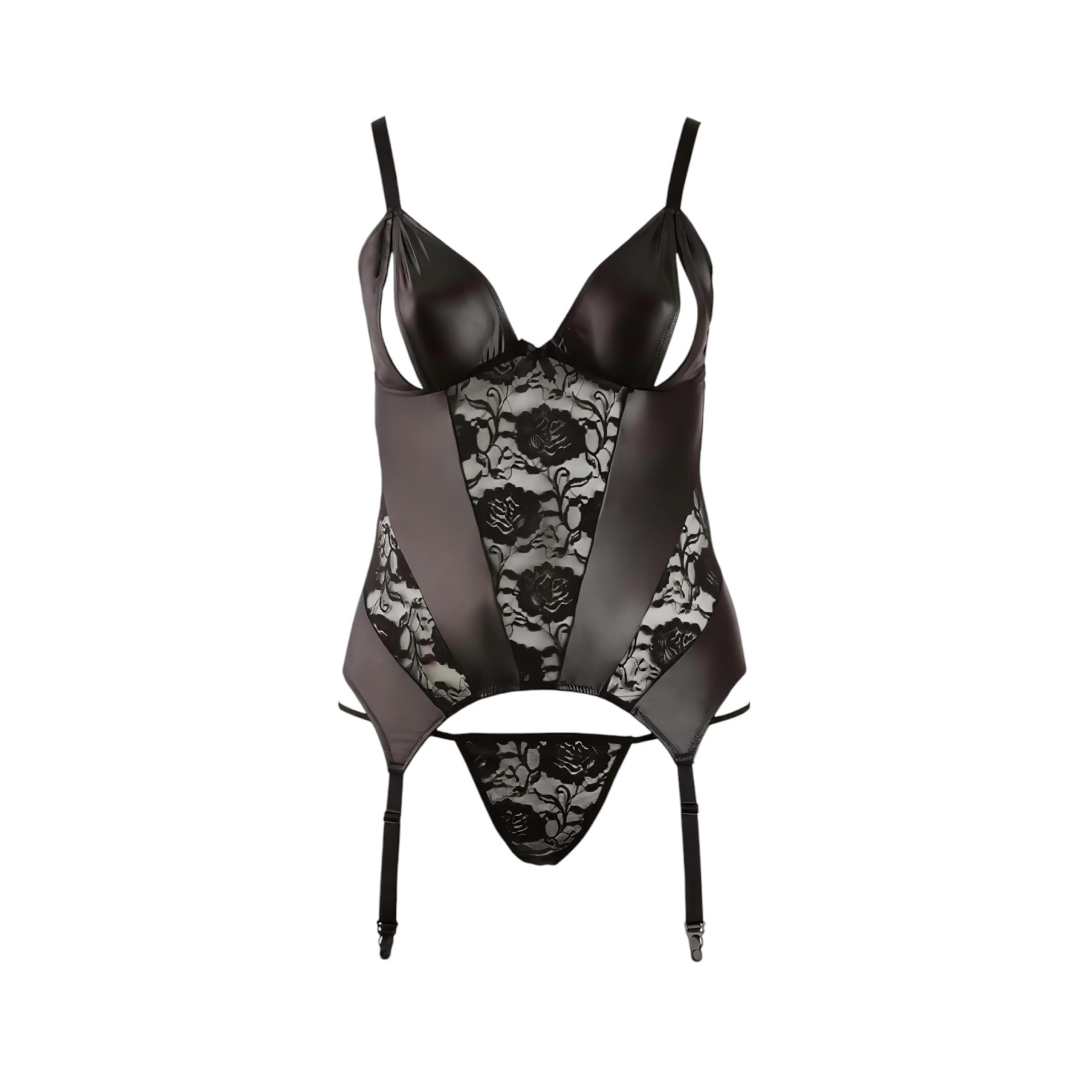 • Design: Voorzijde glanzend wetlook, achterzijde transparante stretchstof, open cups, verstelbare schouder- en jarretelbanden