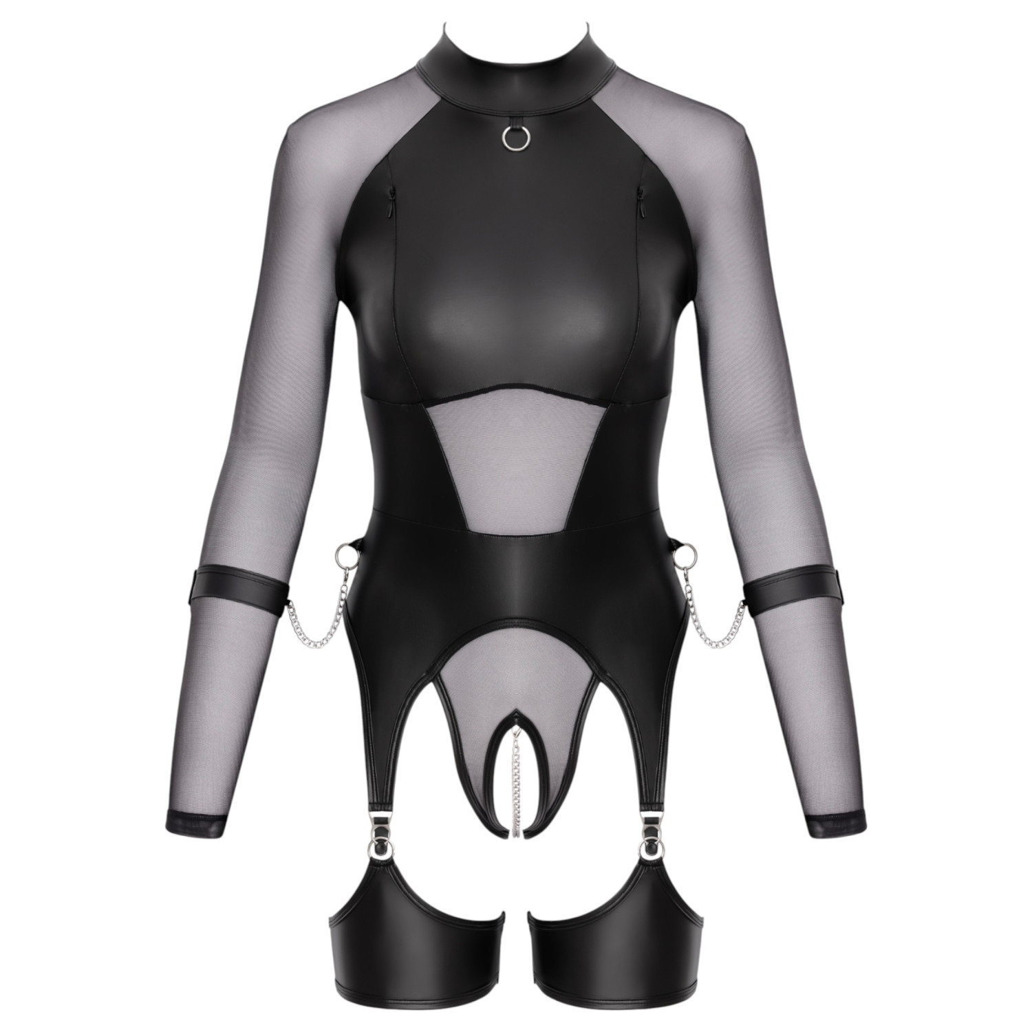 De Cottelli Bondage transparante, glanzende top is de perfecte combinatie van gedurfde erotiek en verfijnd design. De nauwsluitende, lange mouwen body is gemaakt van transparante en matte materialen, die zowel elegant als provocatief zijn. De afneembare ketting boven de intieme opening, de afneembare dijbanden en de verborgen ritsen bij de borsten garanderen opwinding. De in de set opgenomen zachte boeien kunnen worden bevestigd aan de ringen aan de zijkant van het lichaam, wat een echt veelzijdige en fantasierijke speelervaring biedt.
