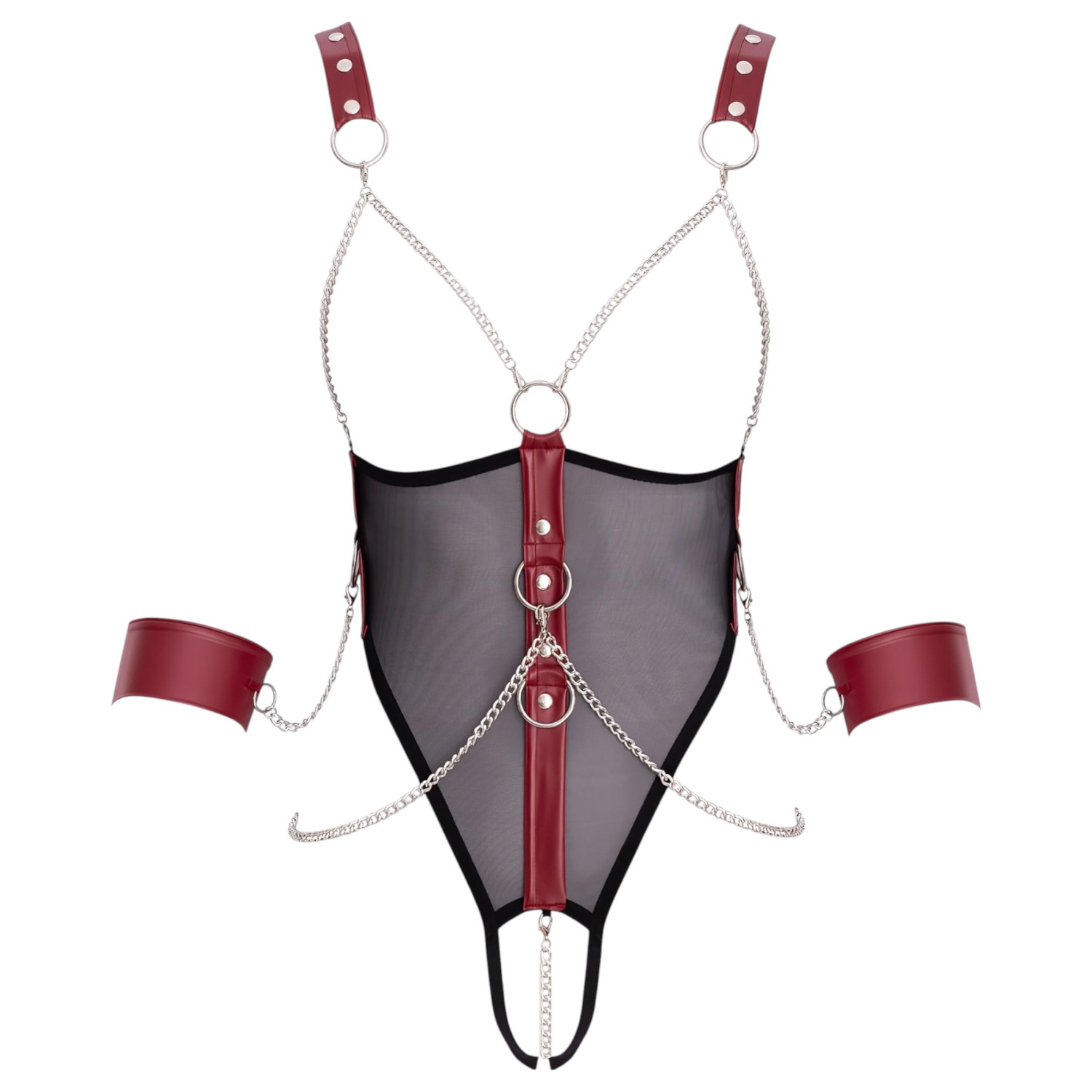 Laat je passie de vrije loop met de Cottelli Bondage open body met bandjes, ketting en zachte boeien!