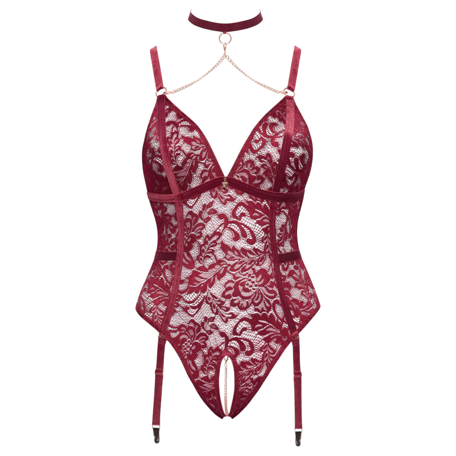 De Cottelli Curves kanten body met ketting is de ideale keuze als je op zoek bent naar lingerie die gegarandeerd de aandacht trekt. Het dieprode kant, de fluwelen bandjes, en de roségouden metalen details zorgen voor een speciale, luxe uitstraling. Het meest spannende element van de body is de afneembare halsband (choker), de afneembare kettingen rond de hals en de stimulerende kruis ketting, die zich bevindt boven de volledig opengewerkte opening en afneembaar is. Het elastische kant biedt een comfortabele, perfect aansluitende pasvorm, terwijl de verstelbare bandjes volledige maatvoering mogelijk maken. De jarretelbandjes en kettingen zijn afneembaar, zodat de body eenvoudig kan worden aangepast voor een gedurfde of ingetogen stijl.