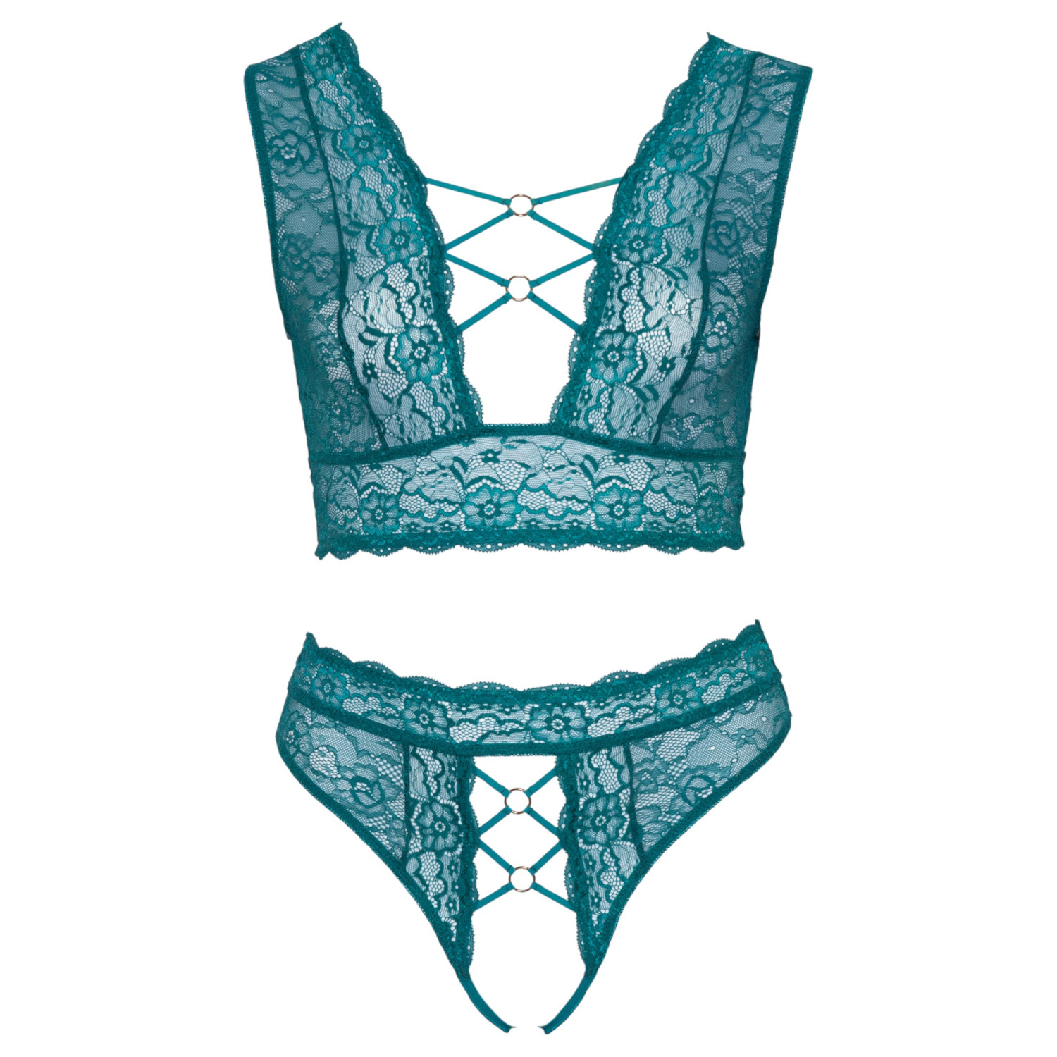 De Cottelli Curves kanten set met veter is gemaakt van zacht, elastisch kant, waardoor het prachtig aansluit op het lichaam en de hele avond comfortabel is om te dragen. De diep uitgesneden bralette heeft zowel aan de voor- als achterkant een bijzonder provocatief ontwerp, dat bijeen wordt gehouden door roségouden ringen en elastische bandjes. De high-waist, open slip wordt alleen aan de voorkant bij elkaar gehouden door ringen en dunne bandjes, wat een zeer erotische uitstraling geeft – een echte verleidelijke stuk. Het teal-kleurige kant is bijzonder elegant en verfijnd, waardoor de set zowel uitnodigend als exclusief is.