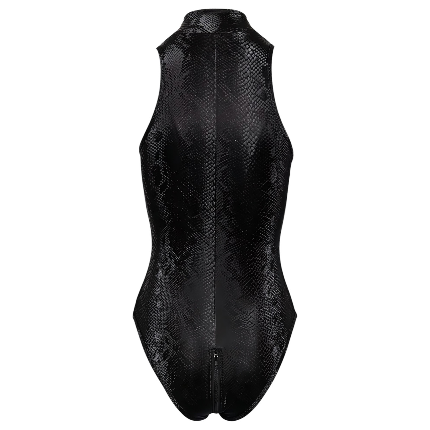 Body met slangenleer-patroon, hoge kraag en tweerichtingsrits van de kraag tot helemaal aan de billen! Met deze glanzende slangenlook straal je pure mysterie uit!