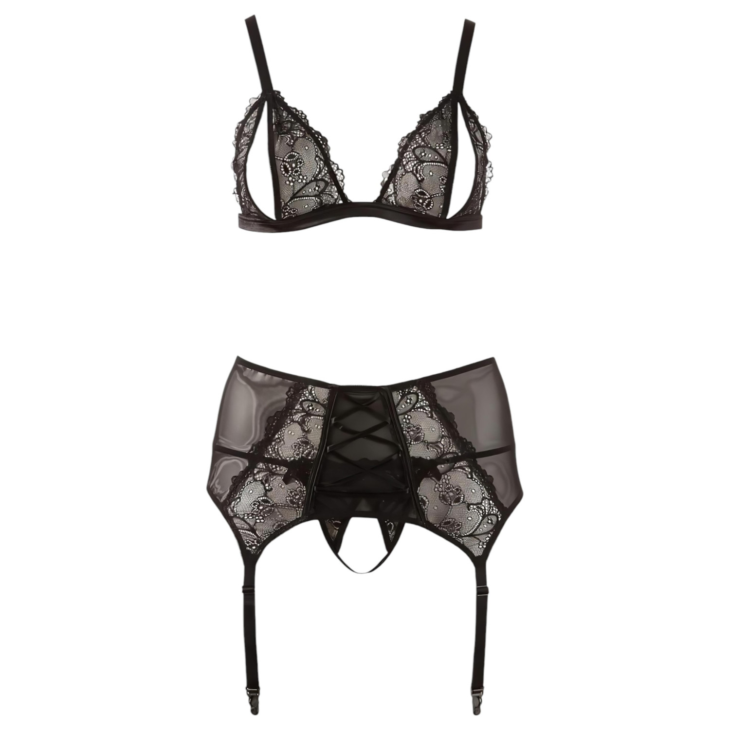 • Verleidelijk design: De open bh laat je borsten mooi uitkomen, terwijl de jarretelgordel met satijnen veters aan de voorkant je look extra spannend maakt.