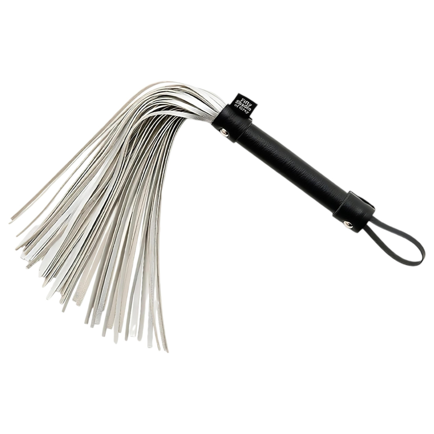 Exclusieve zweep uit de collectie van Fifty Shades of Grey! Een chique zweep met zachte, zilverkleurige strengen, een stevige houten handvat bekleed met zwart leer en een handige polslus.