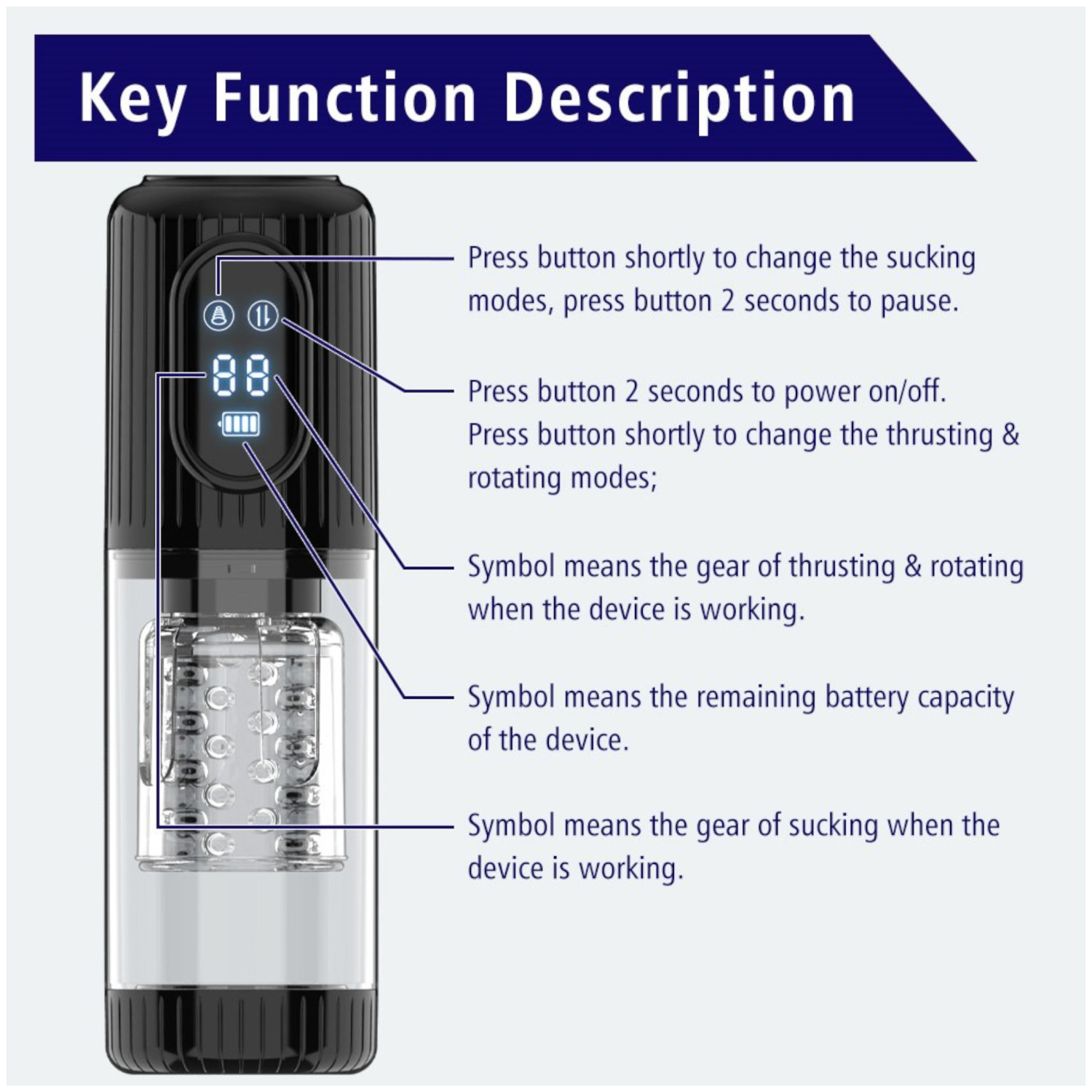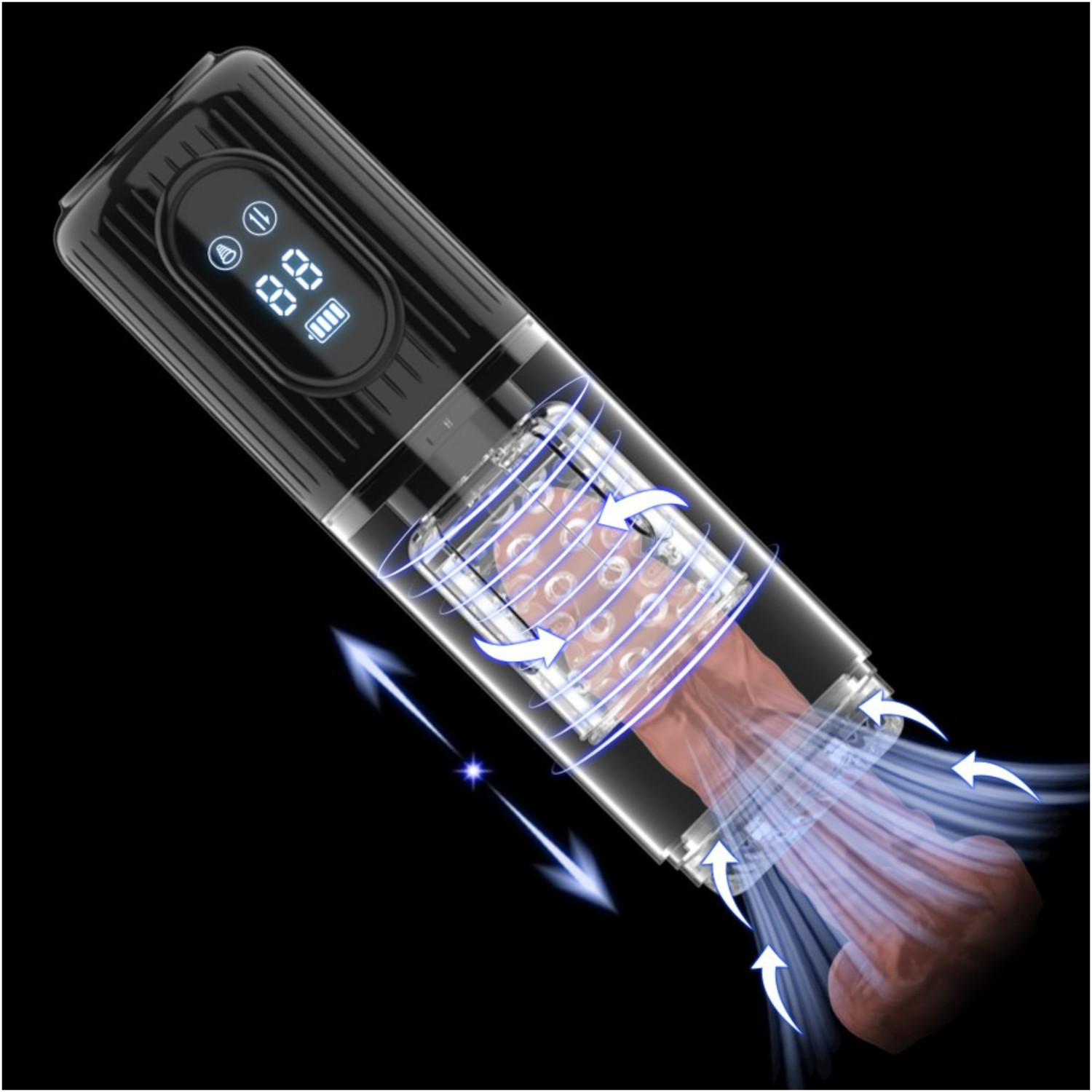 Met de ergonomisch geplaatste knoppen kun je eenvoudig de intensiteit van het roteren, stoten en zuigen regelen, terwijl je op het LED-display eenvoudig de instellingen kunt volgen.