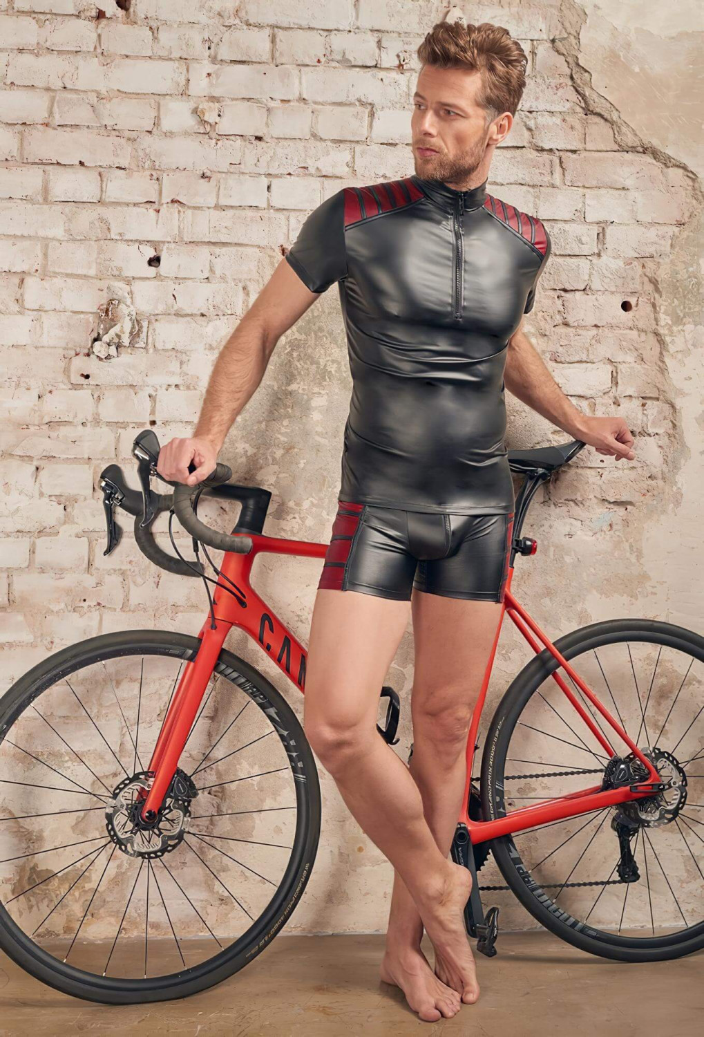 Spectaculaire, glanzende stoere heren top, met bordeauxrode gestreepte inzet op de schouders.