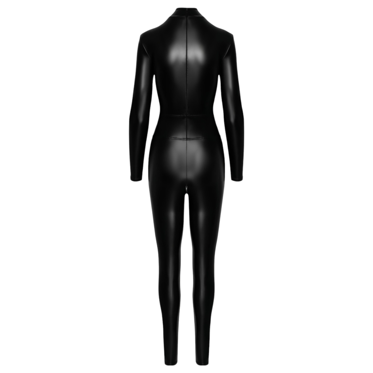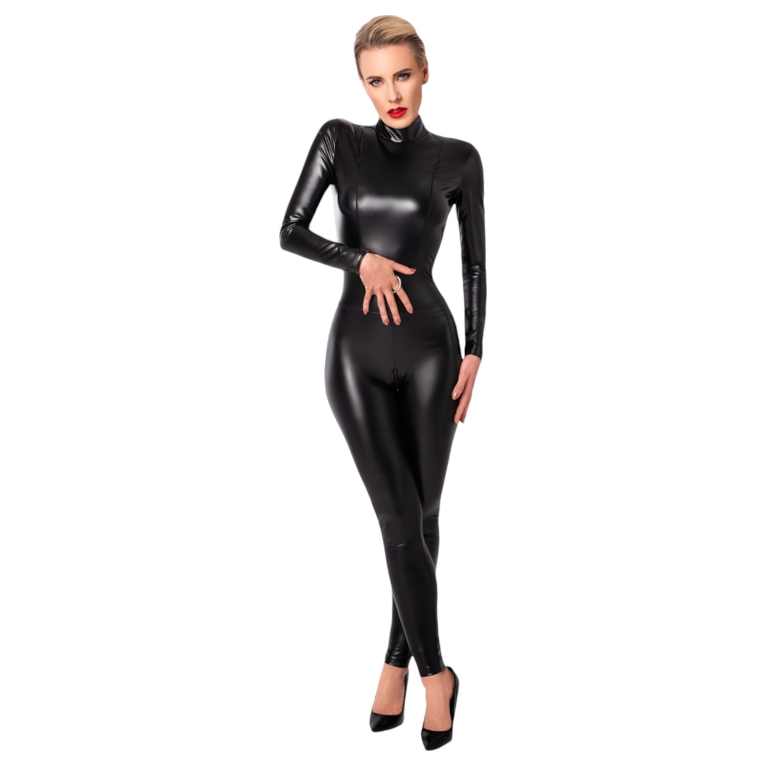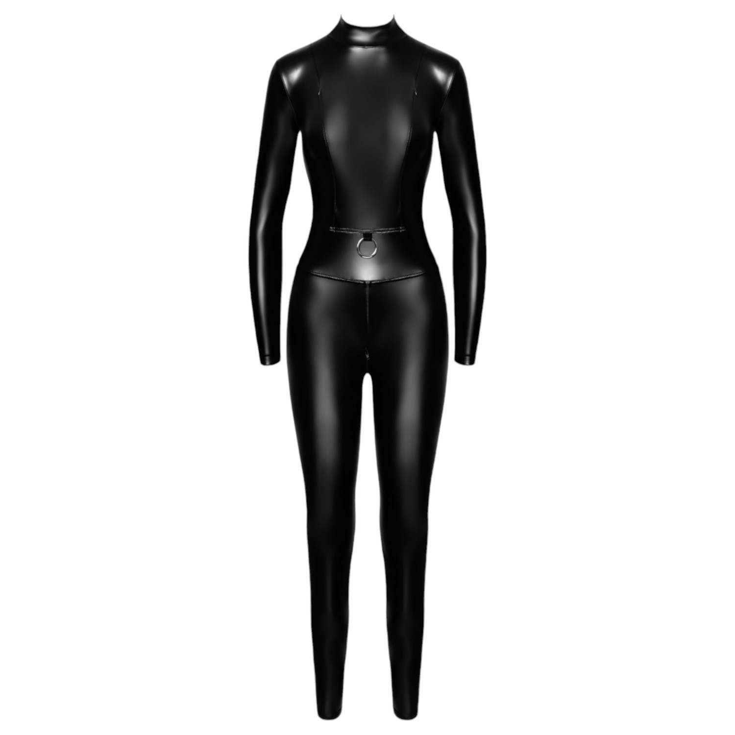 Sensuele catsuit die je hele lichaam bedekt, met stoere ritsen en een opvallende grote ring op de buik.