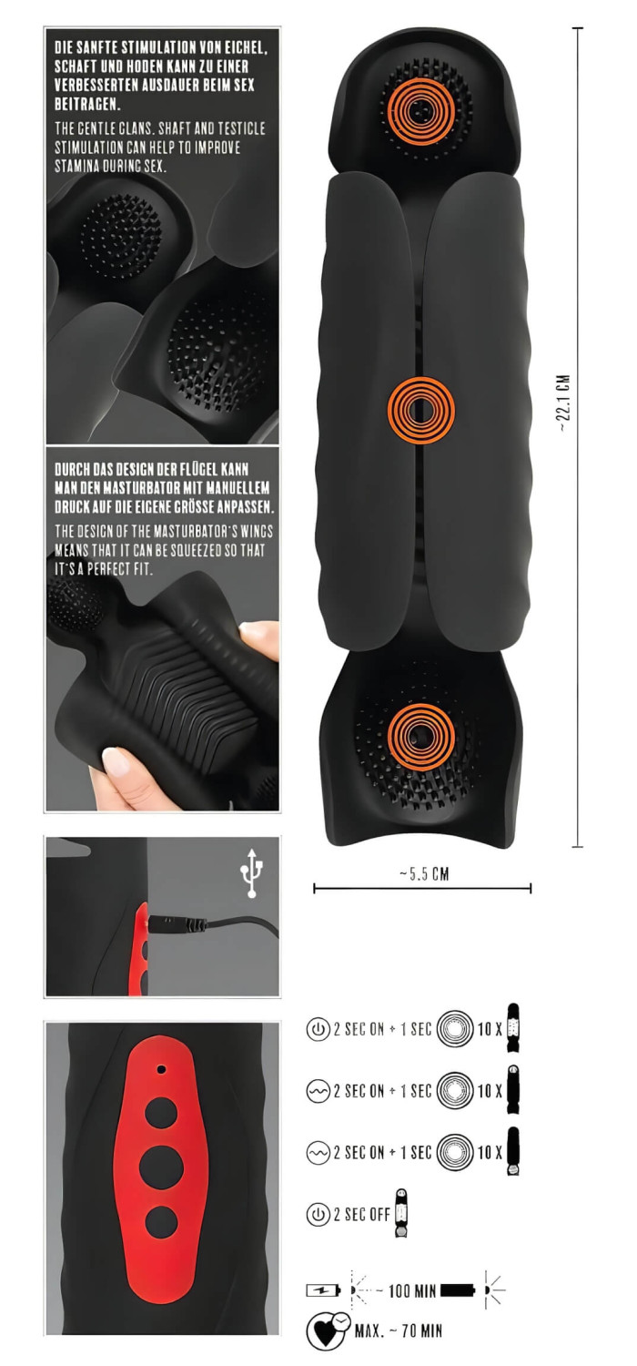 Breng wat glijmiddel aan op je penis en aan de zachte binnenkant van de masturbator. Plaats de masturbator vervolgens om je penis. Zet de trilstanden aan met de knop en kies jouw favoriet. Geniet van unieke sensaties dankzij de verschillende trilstanden. De flexibele vleugels houden alles op z’n plek terwijl de zachte puntjes en ribbels stevig masseren.