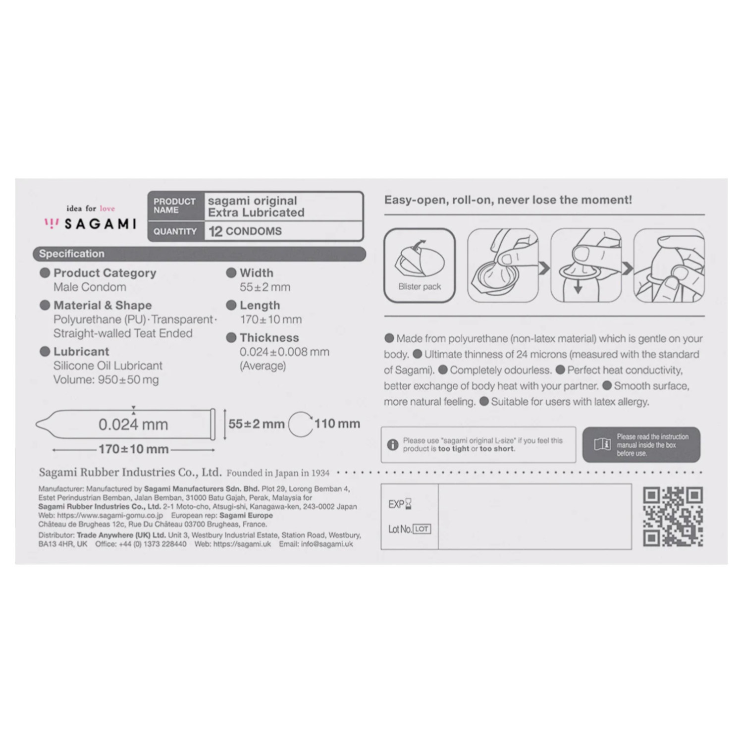 Sagami ontwikkelt al meer dan 90 jaar hoogwaardige condooms die niet alleen gericht zijn op veiligheid, maar ook op het vergroten van intimiteit. Dankzij het polyurethaan materiaal is het condoom reukloos, latexvrij, en biedt het door de uitstekende thermische geleidbaarheid een nog natuurlijkere ervaring. Het extra glijmiddel maakt het contact nog soepeler en aangenamer.