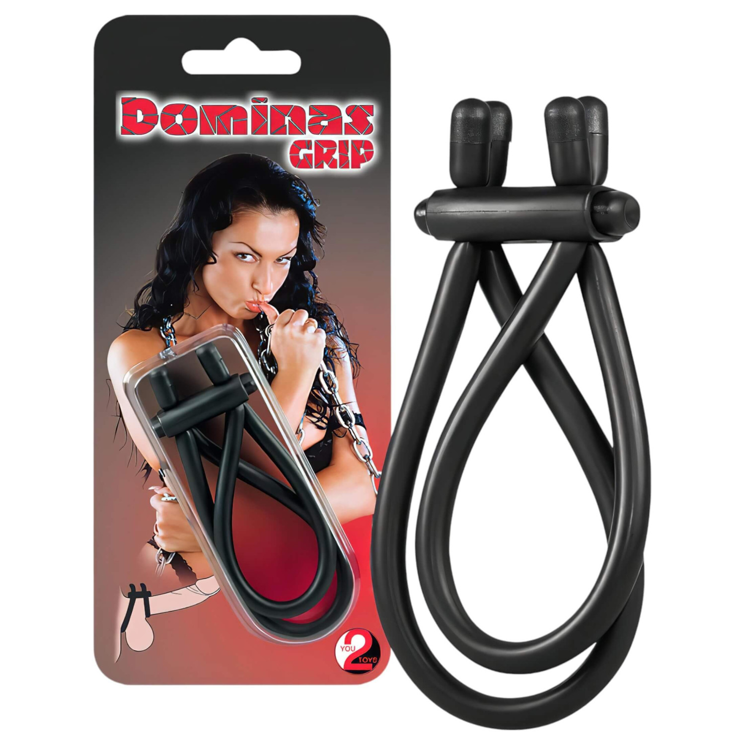 Zwarte, stevige dubbele ring van latex die je erectie perfect ondersteunt. De diameter van de ringen kun je zelf makkelijk aanpassen door op de twee kleine knopjes te drukken, dus hij past altijd, welk formaat je ook hebt.
